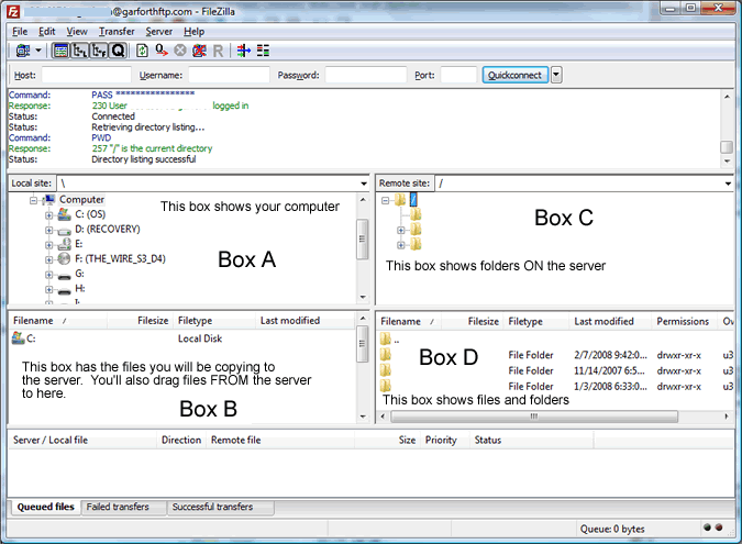 Make sure that you know what directory is selected in Box B so you can retrieve your files after you download them, and also so you can find the files to upload.